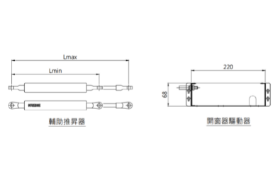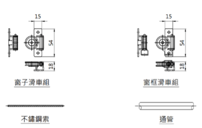 220 68 三鍵電動操作開關盒 120 70 48.5 窗子滑車組 54 15 18 窗框滑車組 54 15 18 滑車鋼索 依窗戶尺寸調整 輔助推昇器(氣壓棒) 依窗戶尺寸調整